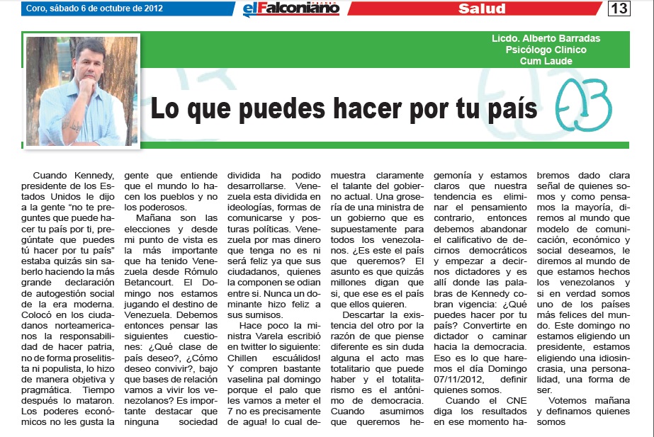 LO QUE PUEDES HACER POR TU PAIS. Articulo publicado en El Falconiano 06/10/2012