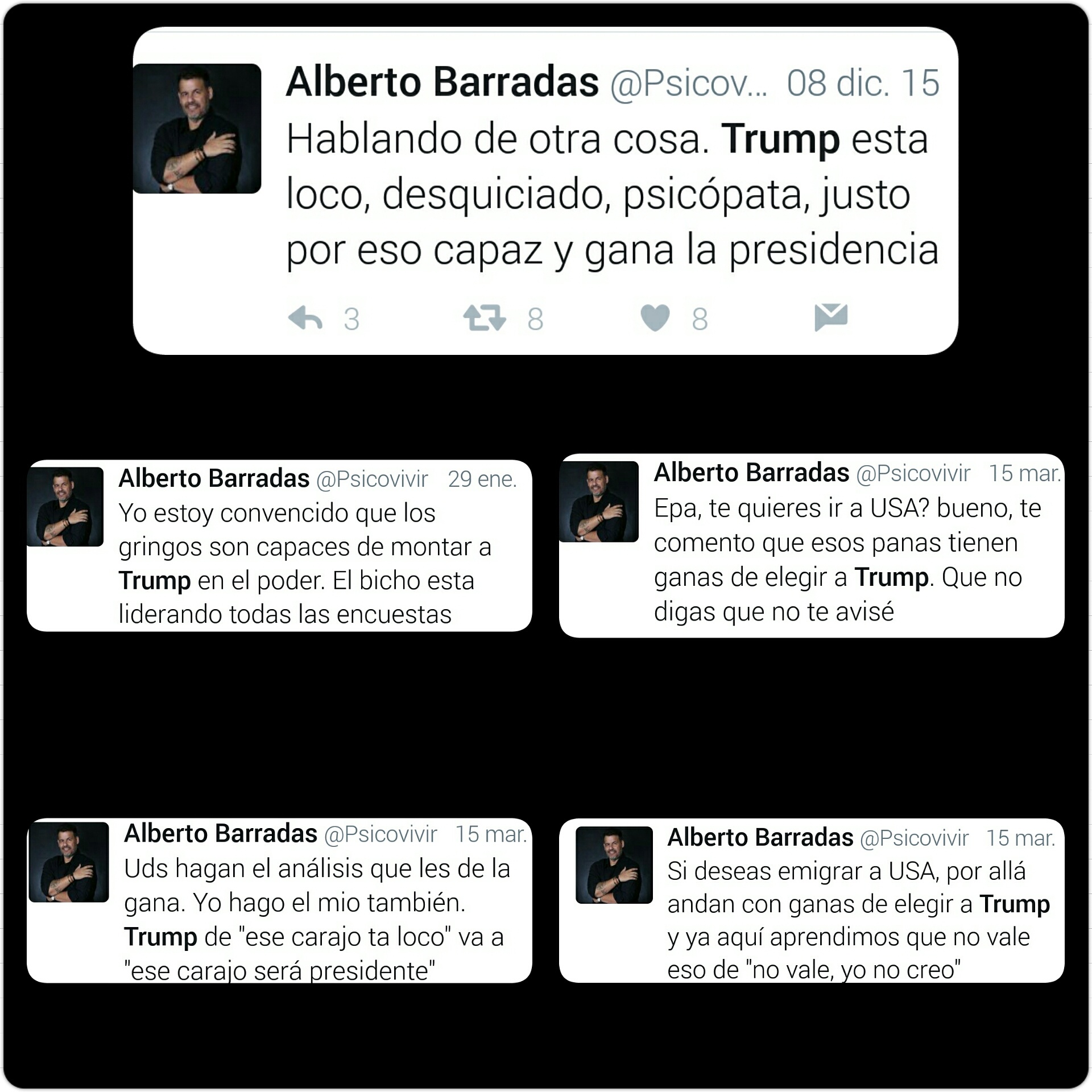 En diciembre del 2015 yo estaba convencido que Trump llegaría a la presidencia de los Estados Unidos. El 29 de enero lo ratifiqué y ya el 15 de marzo 2016 no tenía ninguna duda de que eso pasaría. No fueron pocos los que me tildaron de loco o que yo no se nada de política, y demás improperios. Tienen razón quienes dicen que yo no se nada de política, pero resulta que yo no soy politólogo, soy psicólogo y desde la psicología puedes predecir comportamientos. Trump al lanzarse como presidente la tenía ganada de entrada. Por qué yo lo sabía? Porque el representa el pensamiento oculto del norteamericano común. El es el inconsciente colectivo de esa sociedad. Hay que saber de historia para saber y entender que los norteamericanos en su inmensa mayoría son seres profundamente indolentes a la empatia universal, y ojo, no lo digo por crítica, lo digo por descripción. En todo caso, Donald Trump es hoy presidente de los Estados Unidos. Triunfó el marketing político, triunfó el uso de la psicología analítica y se jodió el resto del mundo. Hoy es un mal día para la humanidad. Lo veremos en los próximos años.