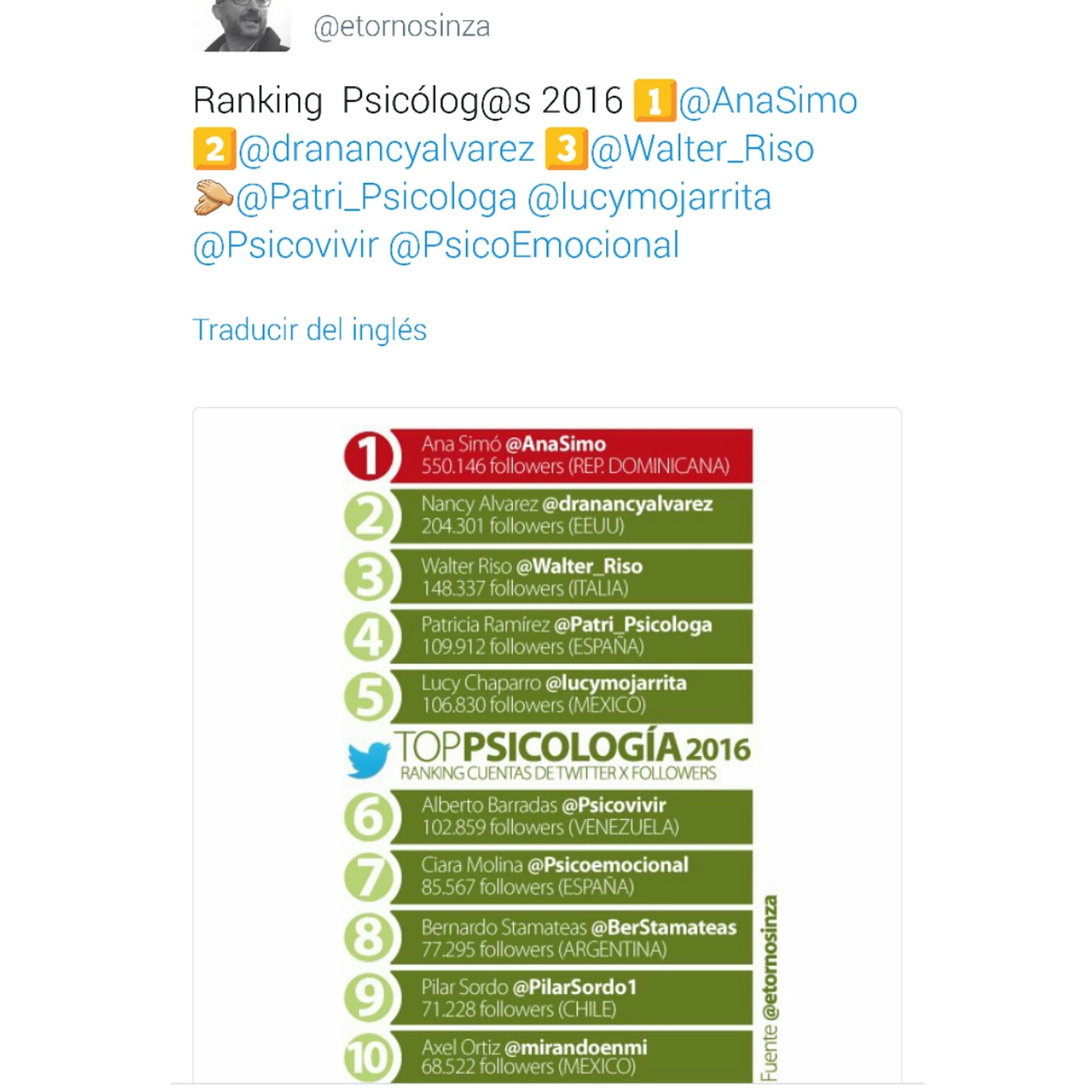 Hoy varias personas me felicitaron por estar en el top ten de psicólogos con más influencia en el mundo. La verdad es que no es así, aunque no deja de ser un privilegio. Les explicaré: la medición se hizo en base a Hispanoamerica (sin contar psicólogos de no habla española). Solo tomó en cuenta Twitter como red social y no otras como Facebook, donde he visto psicólogos con más de un millón de seguidores. En todo caso me siento profundamente privilegiado al estar en este ranking al lado de tan prestigioso psicólogos y agradezco a cada uno de uds por ser siempre amables y consecuentes conmigo.