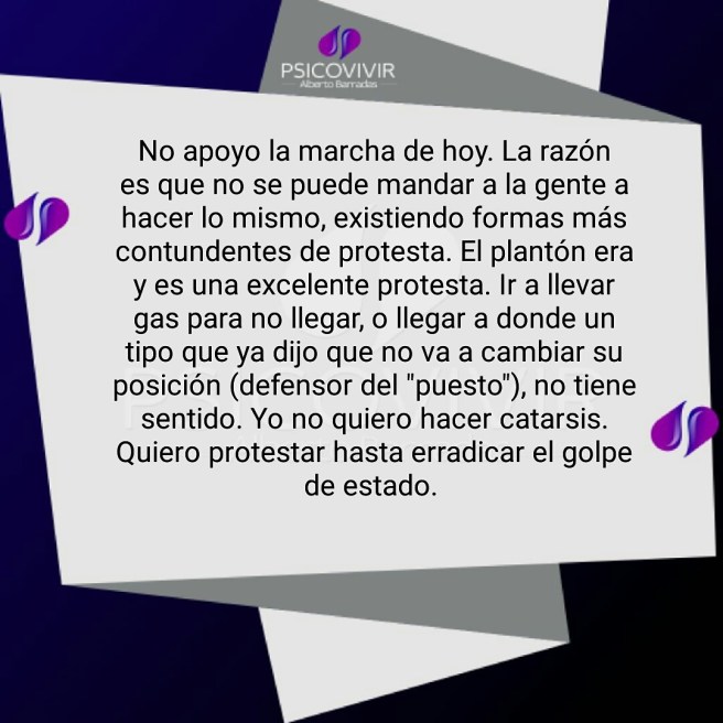 Cualquier persona medianamente culta sabe que los regímenes totalitarios en la modernidad han caído todos por movimientos sociales pacíficos. Solo un ignorante dice que ningún gobierno dictatorial ha caído pacíficamente. Una de las últimas dictaduras, la de Chile, siendo pinochet uno de los más sanguinarios y represores, cayó a punta de votos, solo por citar un ejemplo. Pero en Venezuela tenemos una situación inedita: una oposición ligera. Es hasta hace muy poco que empezaron a hacer las cosas bien, se unieron y empezaron a liderar protestas en la calle, junto a la gente y en primera línea. Pero ahora volvemos a lo mismo de siempre, hacer protestas sin sentido y sin objetivo. Ir donde el defensor del pueblo, cuando ya dijo que el no apoya destituir tsj, es ir a hacer nada. Se iba donde el porque le exigimos cumplir su rol. Ya dijo que no lo hará. Bien, hay que cambiar todo el sistema. Se protesta al sistema, o al menos así debería ser. Que hacer? Cambiar métodos. Presionar más, más contundentes (plantón, paros, trancas y cientos de protestas más, y diferentes), tenemos muchos ejemplos, tenemos literatura, videos, historias suficientemente documentadas de miles de formas de protesta pacifica pero profundas. Por qué la dirigencia opositora, teniendo los medios, la gente, la maquinaria y la voluntad de millones de opositores, sigue la ruta de hacer lo mismo, para lograr solo el cansancio, es solo una respuesta que lleva a respuestas oscuras, que pensé que ya habíamos superado. He participado de todas las protestas, de una forma u otra, pero esta no. Yo no quiero ir donde el defensor del pueblo, yo quiero salir de esto, y salir de esto, no pasa por ir a recibir gas y perdigones, por un objetivo que no tiene sentido. Pasa por establecer objetivos políticos, llevar una protesta masiva, diaria, profunda, pacifica, sólida y creativa, sin descanso y nacional, para que el sistema colapse, dimita y se vaya. #HabiaQueDecirlo (no abriré comentarios, ya que esta es una posición personal que no estoy dispuesto a cambiar ni a que se tergiverse, ni tampoco a generar un foro donde se caigan a insultos, cosa que siempre pasa cuando hablo de política).