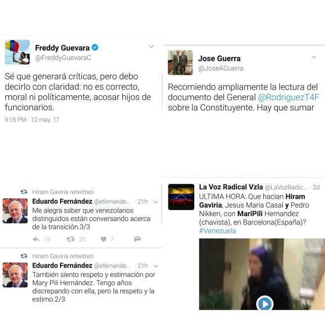 En Venezuela vivimos tiempos difíciles. Dolor, intolerancia, odio, muertos, presos y heridos. Los que viven fuera de Venezuela saben mucho más que los que vivimos dentro, ya que la censura es enorme. Los venezolanos están en la calle y todos luchamos desde nuestras trincheras y posiciones políticas e ideológicas. Yo como psicólogo siempre intento mantener la objetividad y para sortear la censura, intento ver los movimientos que aparentemente parecen desconectados y trato de darles sentido. En los últimos dos días he visto esto: en España dirigentes opositores y chavistas se reúnen, un diputado opositor recomienda leer a uno de los represores chavistas más cuestionados por su crueldad en las protestas del 2014, y un líder político de importante prominencia actualmente, además de diputado, cuestiona que se proteste a hijos o familiares de posibles corruptos del gobierno. Si uno ve todo por separado, parecen hechos aislados, pero si los unes puedes entender lo que está sucediendo. Yo hice mi análisis pero no se los diré. Yo quiero estimular en uds la capacidad de observar fríamente los hechos y manejar la realidad con cierto desapego emocional. Saquen uds sus conclusiones sobre todo esto. Allí se los dejo.