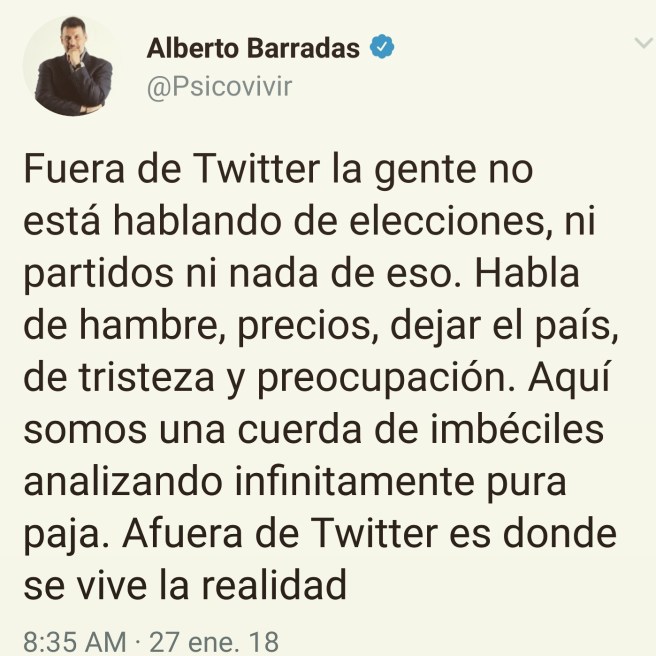 Cuando yo empecé en Twitter era una red maravillosa. Prácticamente no había anónimos, se usaba para compartir ideas y aunque siempre había gente estúpida metiéndose con las ideas de los demás y no respetando criterios diferentes, eso no era mayoría. Allí hice buenos amigos, me hice algo conocido y fue una época realmente fascinante por todas las potencialidades que tenía. Luego empezó la lucha política. En poco tiempo Twitter se llenó de anónimos, una guerra de insultos, una babilonia parecida al infierno de dante y todo se dañó. Ahora Twitter es un interminable baúl de análisis, denuncias y lamentos, acompañado de una guerra sin cuartel de a ver quien insulta mejor en cada tuit al otro. Cualquiera diría que con sólo seguir a personas distintas tienes, pero no es así, tu puedes seguir a cristo en Twitter y cuando lanzas un tuit, viene lucifer a insultarte. Qué es lo peor? Que la gente allí cree que habla por todos y jura que todo lo que dice es sumamente importante, incluso yo mismo a veces he caído en esa imbecilidad, pero no, en esta oportunidad en Venezuela estamos totalmente errados, lo que se habla en Twitter no se habla en la calle. En la calle hay una situación distinta y completamente alejada a esa red. Para qué sirve Twitter? Para informar y ayudar, al menos en Venezuela esa sería la capacidad ideal de esa red. Instagram es difícil mantenerle la secuencia, Facebook es una red con demasiado ruido, así que Twitter sería maravillosa para compartir noticias reales, en tiempo real, y también para ayudar a conseguir medicinas, además de ayudar al necesitado. Pero para usarla de esa manera tendríamos que ser inteligentes, razonables, serios, educados, con sentido social, democráticos, y si eso fuéramos como sociedad, no sería necesario usar Twitter de esa manera ya que no tendríamos un régimen y un liderazgo opositor tan nefasto como el que tenemos. En todo caso mi invitación es a usar esa red de forma más social, más informativa, analítica pero no infinita y obviamente a bloquear a todo el que insulte, no respete criterio ajeno, solo desee sabotear y mantenga una actitud de afrenta ante cualquier cosa que digas. #HabiaQueDecirlo