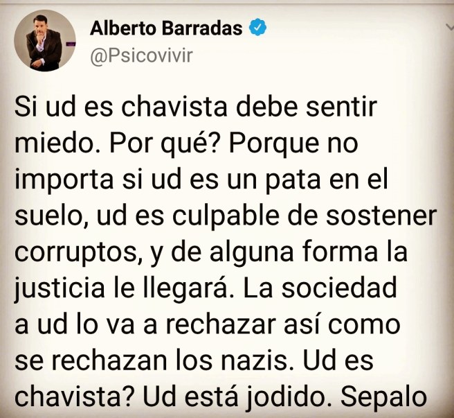 Hace días escribí este tuit y desde ese momento tengo al chavismo vuelto odio en mi TL. Viceministros, Trapiello, algunos medios, Iris Varela y más andan vociferando en contra de mi. Por fin.