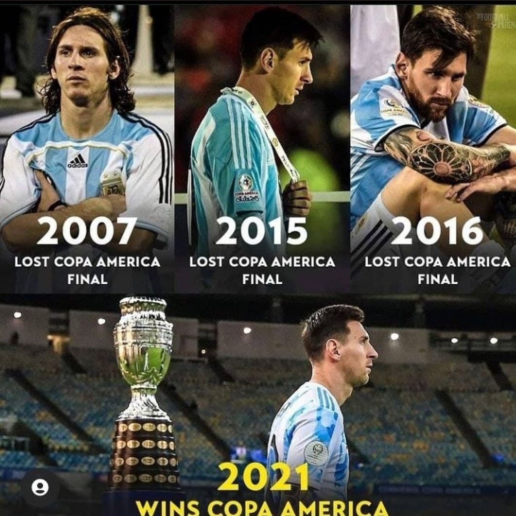 2. El fracaso es la escalera al triunfo. Creo que todos hemos visto sufrir a Messi cada vez que pierde una copa. Es uno de los mejores del mundo, jamás se podrá volver a hablar del fútbol sin hablar de él, pero no había ganado una copa América con su equipo. Fracasar no es perder, fracasar es dejar de intentarlo, eso nos enseña Messi, y es una poderosa lección de vida. La alegría de ganar contrasta con las muchas veces que perdió. Y eso también es una reflexión: no se cuenta las veces que perdiste, siempre contará la que ganaste.