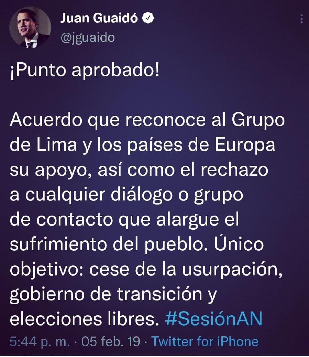 Este tuit de @jguaido tiene 2 años. Hoy van a un diálogo que desde ya advierto, no llevará a nada. Quizás algunas elecciones fraudulentas, como siempre, y ya. Cohabitación. Como ha sido estos 21 años y como seguirá siendo con esta gente siendo protagonista del más grande engaño del mundo.
